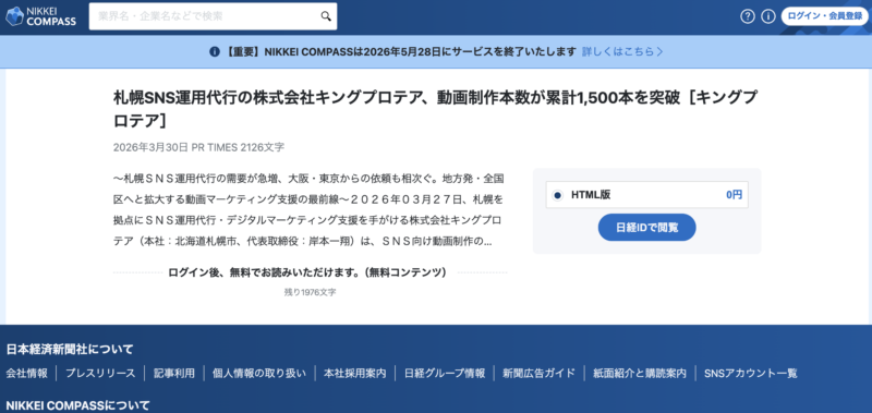 日本経済新聞社「NIKKEI COMPASS」に動画制作本数が1500本を越えたことが掲載されました
