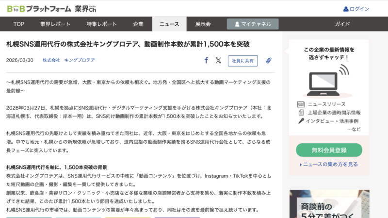BtoBプラットフォーム 業界チャネル株式会社インフォマートに動画制作本数が1500本以上達成したことが取り上げられました。